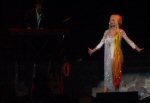After the opening set, we watched a slide show of Dolly's childhood photos and then a wacky reel of her posing and making funny faces with a parasol. As the stage went dark and the music started, I tried to reconcile the fact that I was going to see Dolly Parton in the flesh. At the moment she stepped onto the stage in her white, rhinestone-encrusted toreador outfit, I became very excited and my giddiness only increased as the show went on. She did a whirlwind recap of all her pop hits, singing only one verse of each one to make time for her more interesting material. Her rendition of "I Will Always Love You" was better than all her recordings, and she sang "Little Sparrow" with only a fiddle accompanying her, letting it all out Appalachian style. Jeremy was happy that she donned her gospel garment (pictured at right) and sang "Go to Hell," which is her big kiss-off to Satan himself!